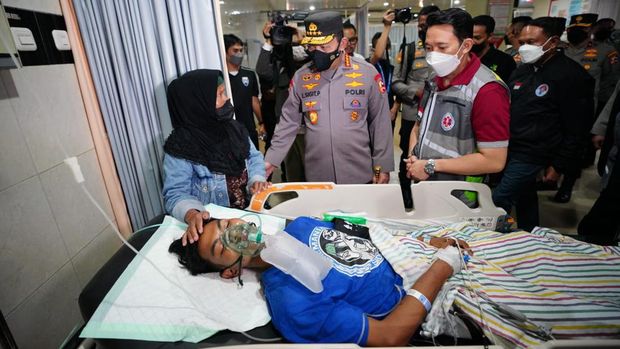 Jakarta – Kapolri Jenderal Listyo Sigit Prabowo menjenguk korban luka-luka tragedi Kanjuruhan yang dirawat di RSUD Kanjuruhan, Malang, Jawa Timur. Sigit menanyakan kepada tim medis kondisi pasien yang sedang dirawat. Dokter lalu memaparkan beberapa kondisi pasien kepada Sigit. Dokter menyampaikan beberapa pasien yang mengalami gejala ringan sudah boleh pulang.