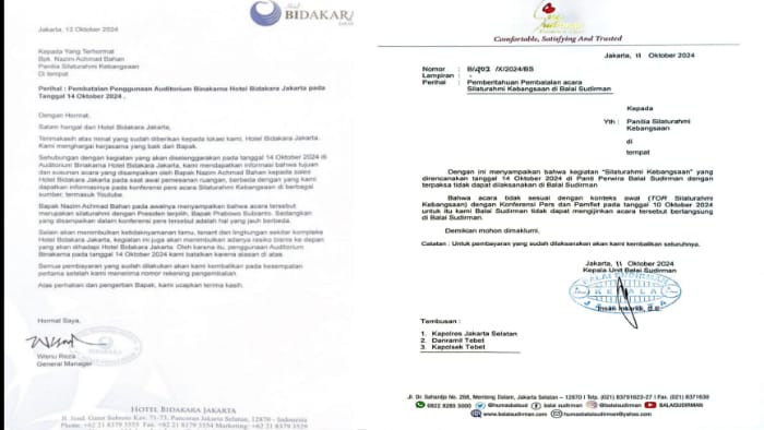 Pasalnya, setelah sebelumnya kegiatan Silaturahmi Kebangsaan yang rencana digelar pada 14 Oktober 2024 itu dibatalkan di Balai Sudirman kini giliran muncul pemberitahuan pembatalan dari Hotel Bidakara Jaksel.
