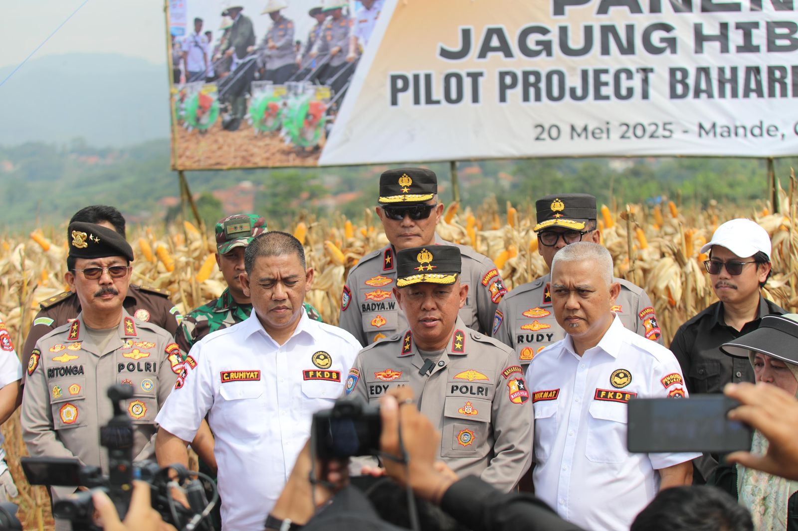 Cianjur, 20 Mei 2025 – Hari Bersejarah untuk Pertanian Cianjur yakni Panen Raya Jagung Hibrida Hasil Sinergi Polri, FKDB, dan Petani Lokal. Tepatnya pada Selasa, 20 Mei 2025 pukul 09.00 WIB, masyarakat Desa Jamali, Kecamatan Mande, Kabupaten Cianjur, menyaksikan momen bersejarah yakni Panen Raya Jagung Hibrida di Lahan Bela Negara seluas 6 hektar. Kegiatan ini merupakan bagian dari Pilot Project Baharkam Polri dan FKDB (Forum Komunikasi Doa Bangsa) yang bertujuan mendukung program ketahanan pangan nasional dan Asta Cita Pemerintah Presiden Prabowo Subianto menuju swasembada pangan.