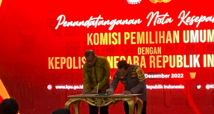 Tanda Tangan MoU antara KPU dengan Polri, Fokus Pengamanan Pemilu 2024Nasional|December 29, 2022by superadminKomisi Pemilihan Umum RI dengan Kepolisian Republik Indonesia meneken nota kesepahaman untuk
