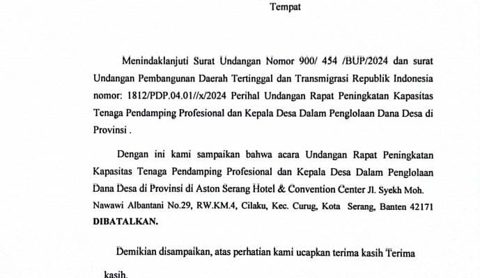 Dugaan Penyebaran Berita Bohong Surat Pembatalan Rapat oleh Bupati Serang Harus DiusutNasional|October 9, 2024by Redaktur BuletinKaffaJakarta – Beredar surat pembatalan rapat peningkatan kapasitas tenaga pendamping profesional dan
